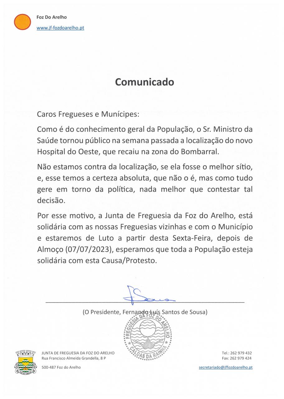 Por esse motivo, a Junta de Freguesia da Foz do Arelho, está solidária com as nossas Freguesias vizinhas e com o Município e estaremos de Luto a partir desta Sexta-Feira, depois de Almoço (07/07/2023), esperamos que toda a População esteja solidária com esta Causa/Protesto.