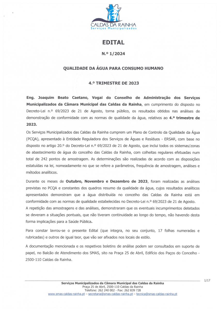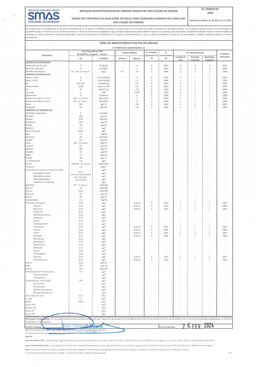 Qualidade da Água Para Consumo Humano 4º Trimestre de 2023